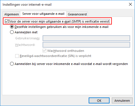 Server voor uitgaande e-mail (SMTP): Geef hier de naam van de uitgaande email server op. Dit is vrijwel altijd smtp server van je adsl- of kabelaansluiting.