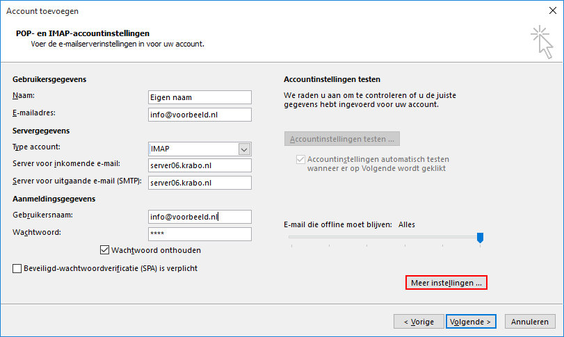 Server voor inkomende e-mail: Geef hier de naam van de inkomende email server op. Dit is vrijwel altijd je domeinnaam met daarvoor mail., bijvoorbeeld mail.uw-bedrijf.nl. Inkomende email server mail.krabo.nl werkt in de meeste gevallen ook.